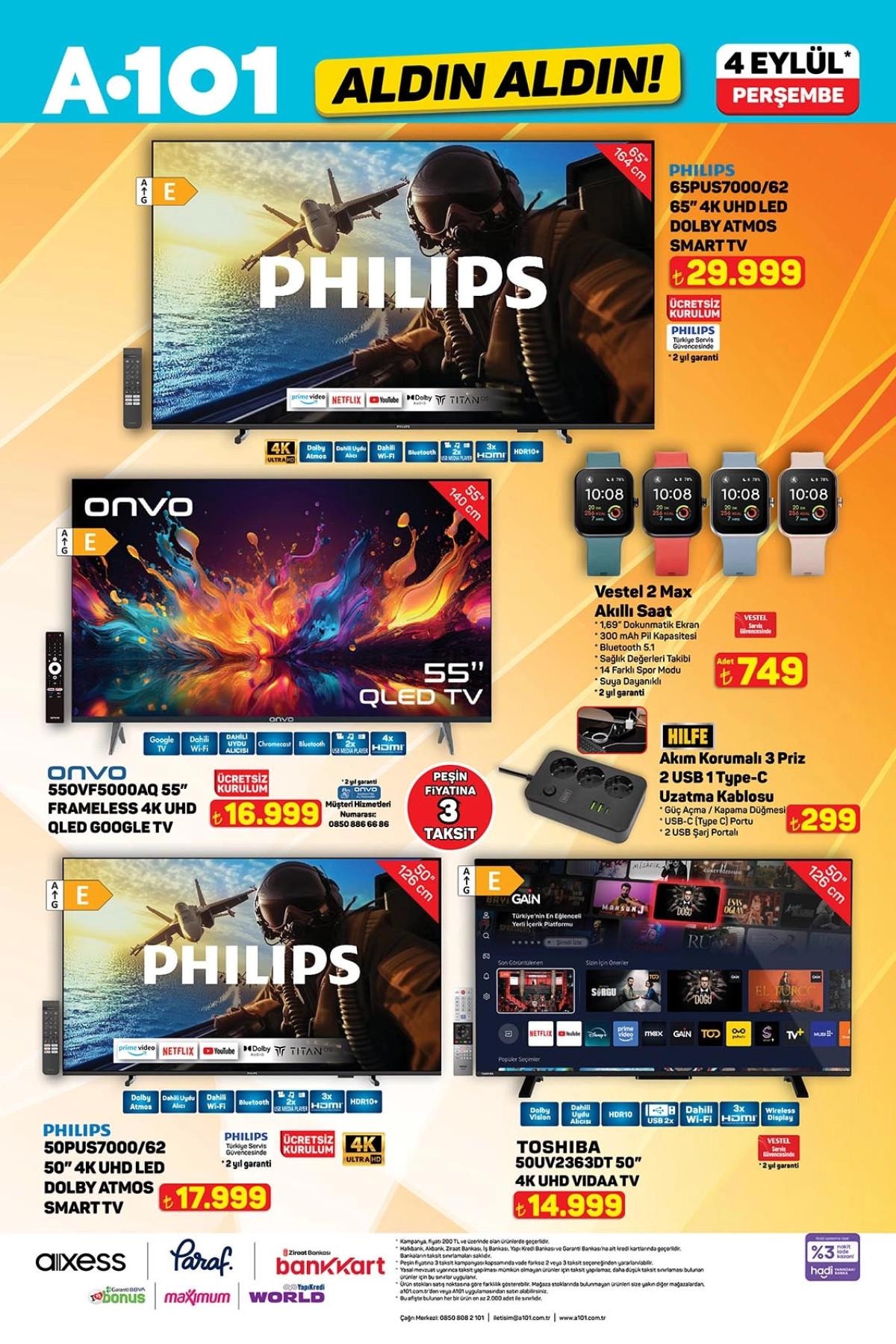 Philips, Onvo, Toshiba ve Vestel gibi markaların akıllı televizyon ve akıllı saat ürünleri katalogda öne çıkıyor. Beyaz eşya arayanlar için SEG bulaşık makinesi, büro tipi buzdolabı ve nofrost buzdolabı gibi ürünler avantajlı fiyatlarla satışa sunuluyor.