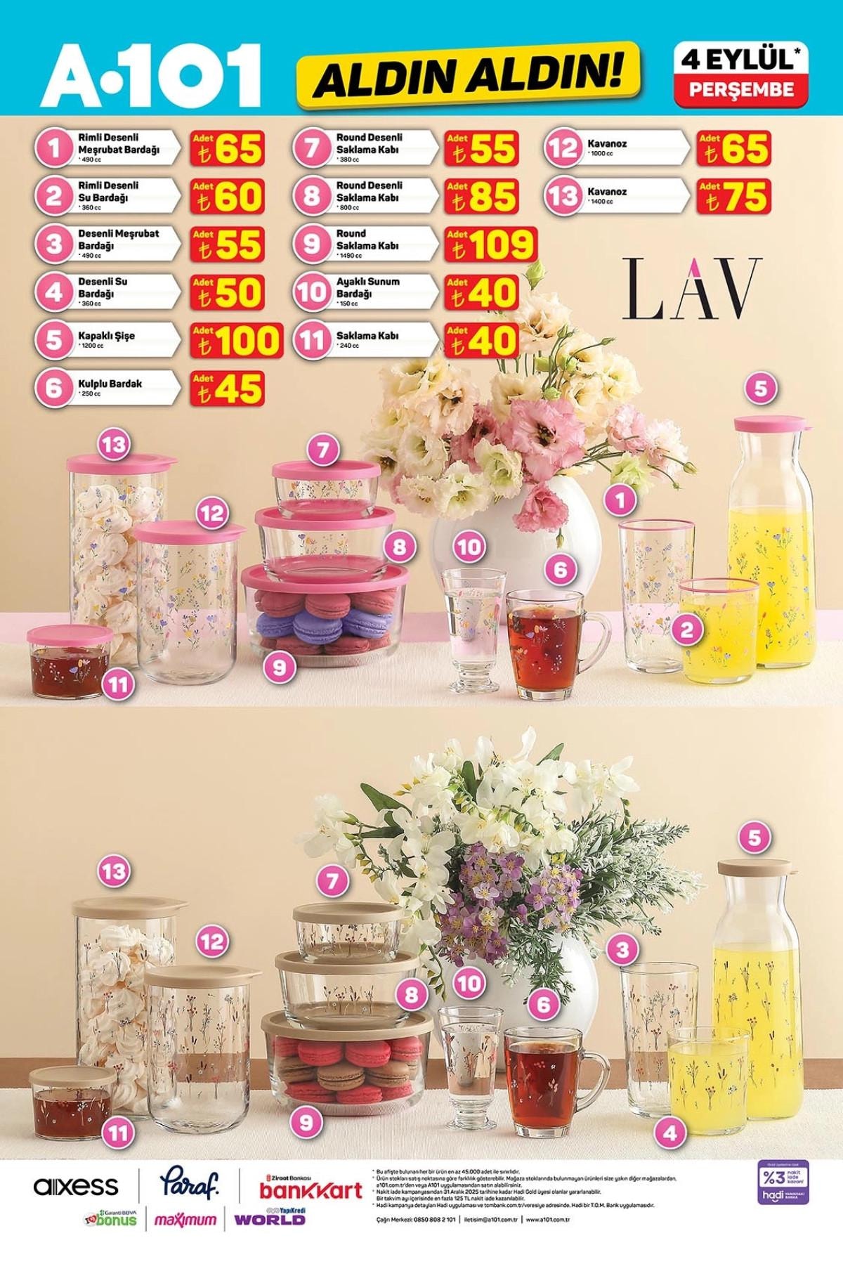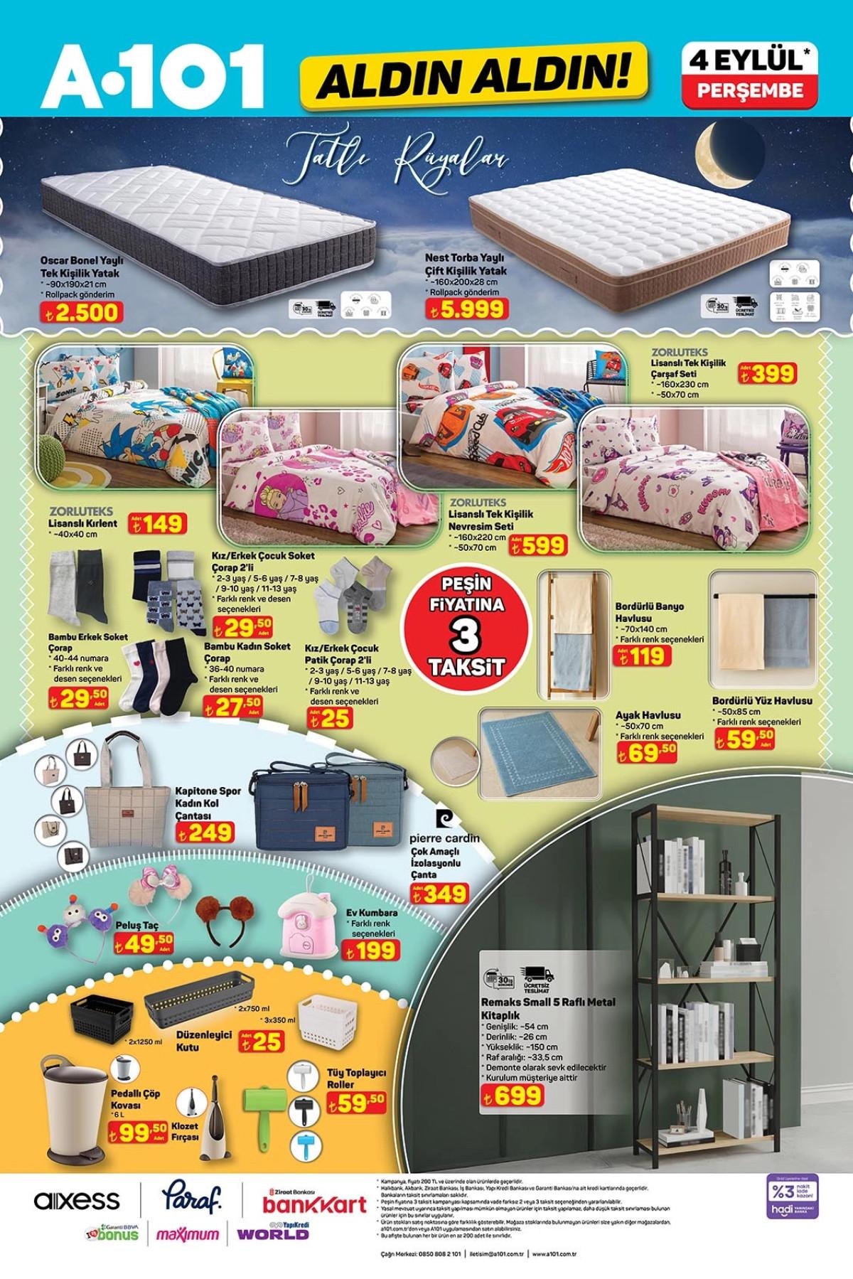 Ev tekstili ve yatak kategorisinde Zorluteks lisanslı ürünler, tek ve çift kişilik yataklar, bordürlü havlular ve çoraplar öne çıkıyor. Züccaciye ürünlerinde Hascevher tencere seti, Papilla tava ve Paşabahçe demlik-kupa setleri gibi ürünler uygun fiyatlarla A101 raflarında yer alıyor.