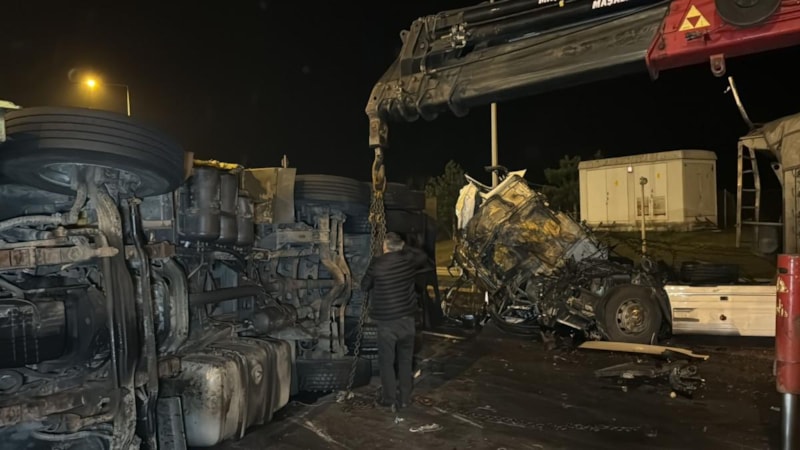 Anadolu Otoyolu Düzce geçişinde tır ile kamyon çarpıştı. Otoyolun İstanbul istikameti trafiğe kapanırken, yolu açma çalışmaları havadan dron ile görüntülendi.