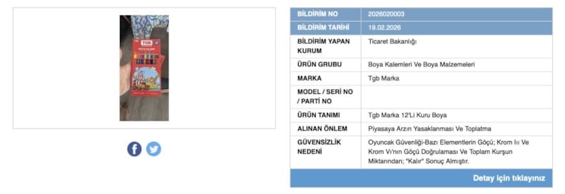 Yapılan teknik incelemelerde, “Tuğba İç ve Dış Ticaret - Mehmet Kalınkara” firmasına ait “Tgb Marka 12’li Kuru Boya” setinde ciddi kimyasal risk tespit edildi.