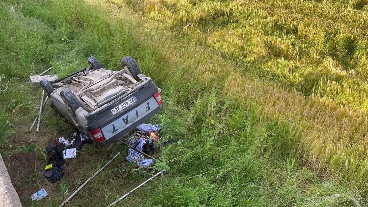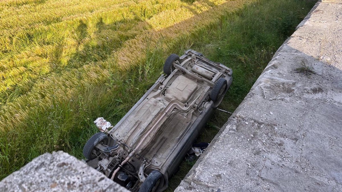 Savrulan araç, köprünün korkuluklarını aşıp tarlaya düşerek ters döndü.
