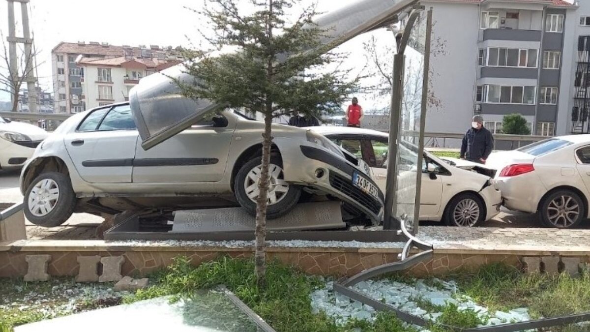 Kalkım Caddesinde direksiyon hakimiyetini kaybeden araç önce orta refüje, ardından ardında ise park halindeki bir araca çarptı. Daha sonra otobüs durağına dalarak durdu.