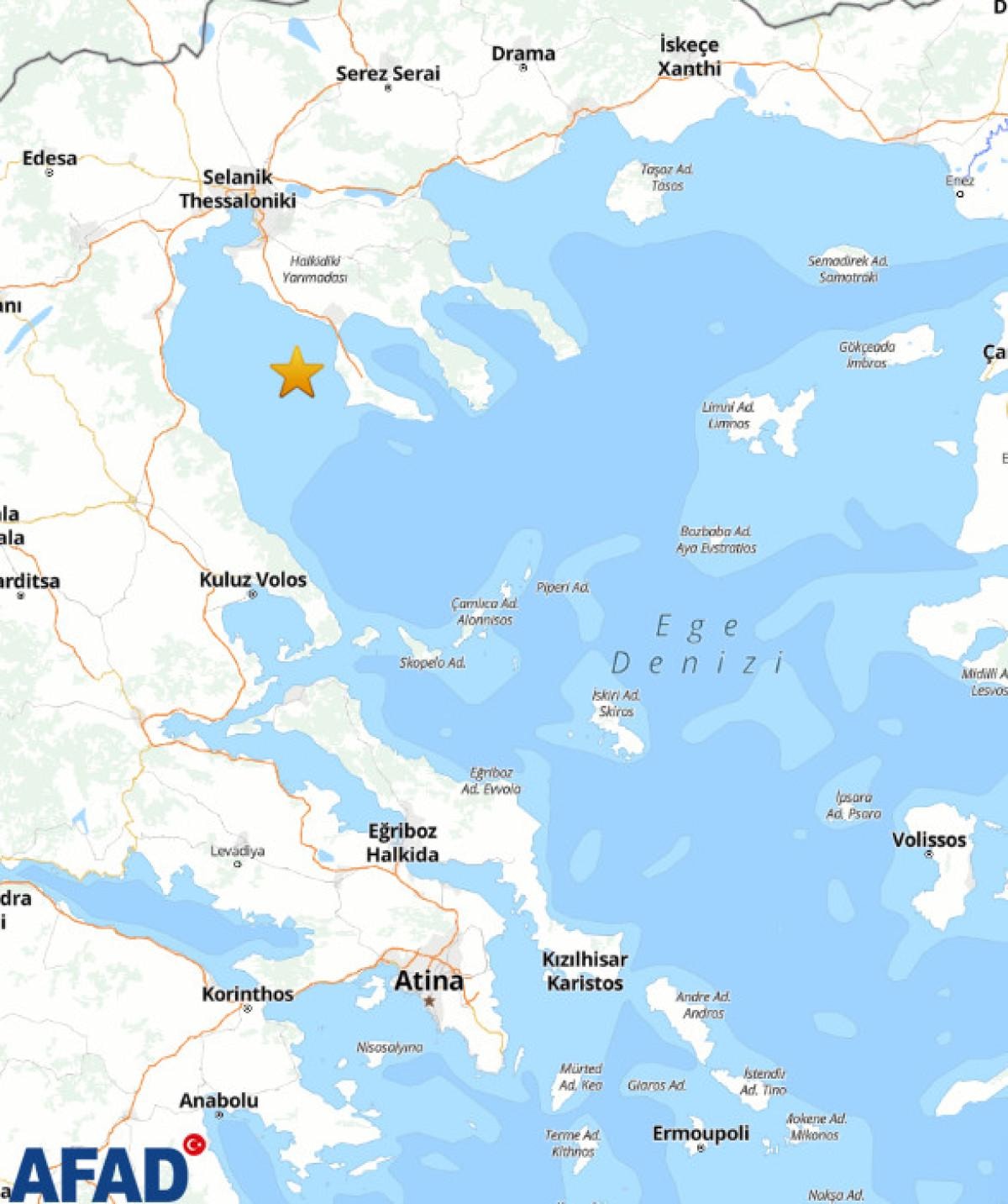 Afet ve Acil Durum Yönetimi Başkanlığı (AFAD), saat 20.03'te merkez üssü Yunanistan'ın Selanik ilçesi açıkları olan Ege Denizi'nde 5.3 büyüklüğünde deprem meydana geldiğini duyurdu.