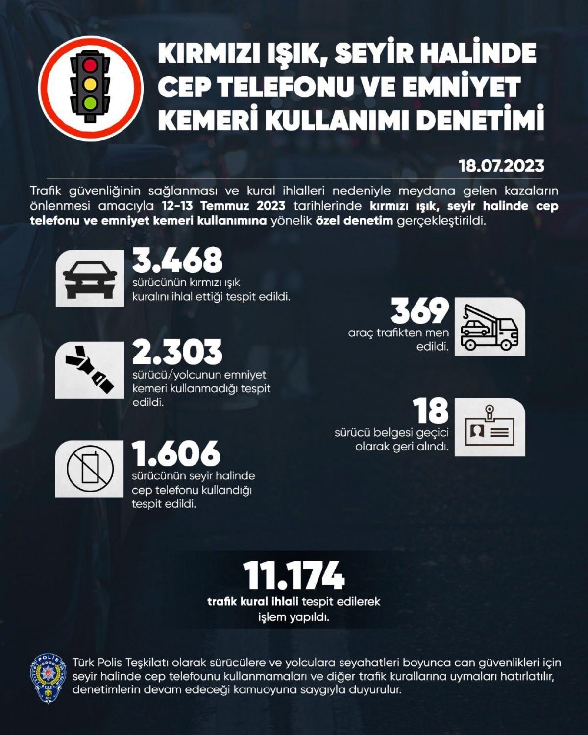EGM'den yapılan açıklamada, 12-13 Temmuz tarihleri arasında kırmızı ışık ihlali, seyir halinde cep telefonu ve emniyet kemeri kullanımına yönelik özel denetim gerçekleştirildiği bildirildi.