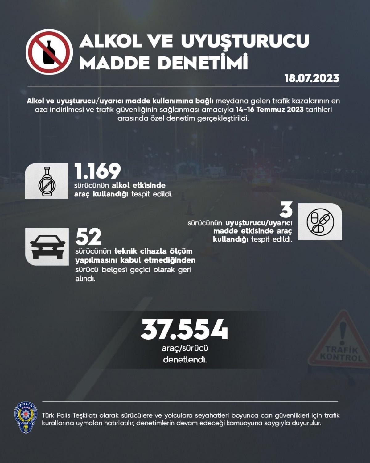 Denetimlerde, 1169 sürücünün alkol etkisinde araç kullandığı, 3 sürücünün uyuşturucu/uyarıcı madde etkisinde araç kullandığı tespit edildi. Kontrollerde, 52 sürücünün teknik cihazla ölçüm yapılmasını kabul etmediğinden sürücü belgesi geçici olarak geri alındı.