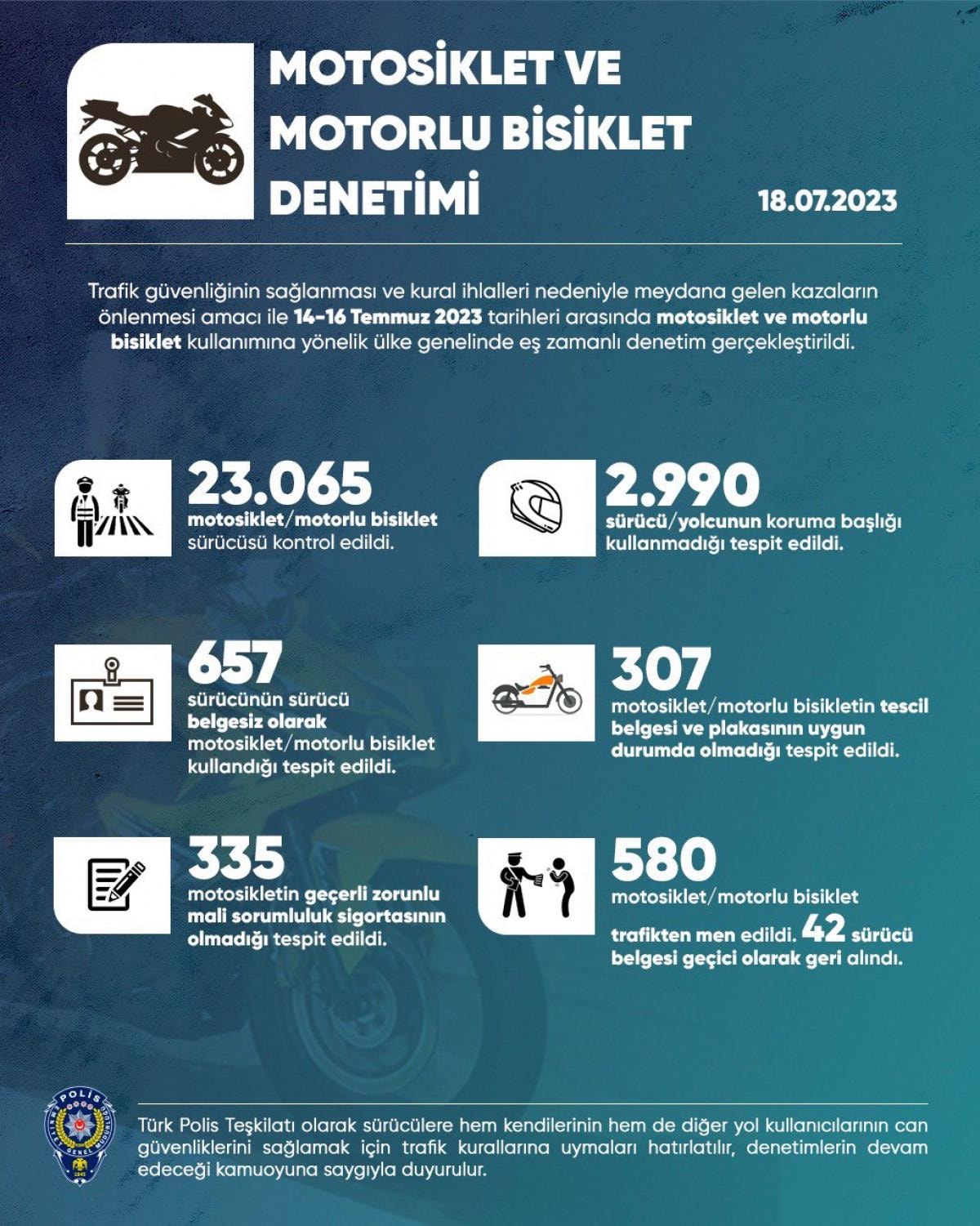 Trafik güvenliğinin sağlanması ve kural ihlalleri nedeniyle kazaların önlenmesi amacıyla 14-16 Temmuz tarihleri arasında motosiklet ve motorlu bisiklet kullanımına yönelik ülke genelinde eş zamanlı yapılan denetimlerde 23 bin 65 motosiklet/motorlu bisiklet sürücüsü kontrol edildi.
