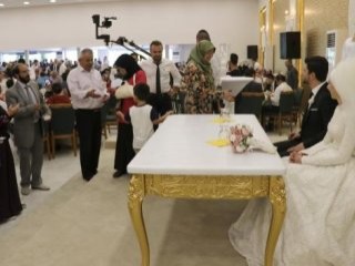 Gelin Fatma Zeybekci ile damat İbrahim Özkan salona girdiklerinde alkışlarla karşılanıp, kendilerine ayrılan özel masaya oturdu. Gelin Fatma Zeybekci yürürken, uzun duvağını arkadaşları taşıdı. Gelin Zeybekci'nin ipekten yapılan özel taçlı gelinliği dikkat çekti ve beğenildi.