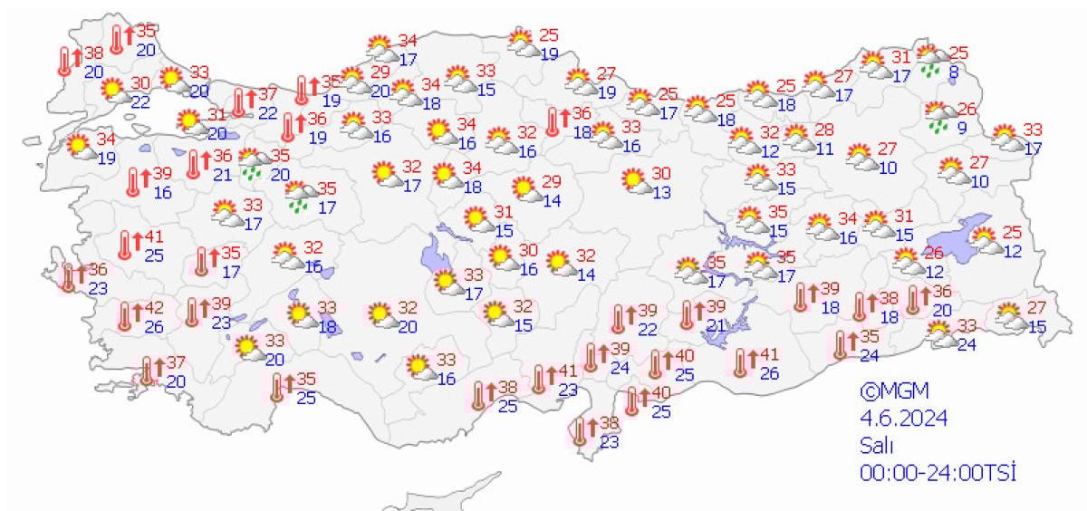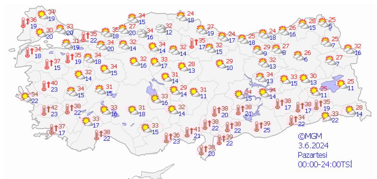 İl merkezlerinde görülecek en düşük ve en yüksek hava sıcaklıklarının İzmir'de 31-35, Aydın'da 36-41, Çanakkale'de 29-35, Balıkesir'de 34-40, Manisa'da 35-41 derece olacağı belirtildi.