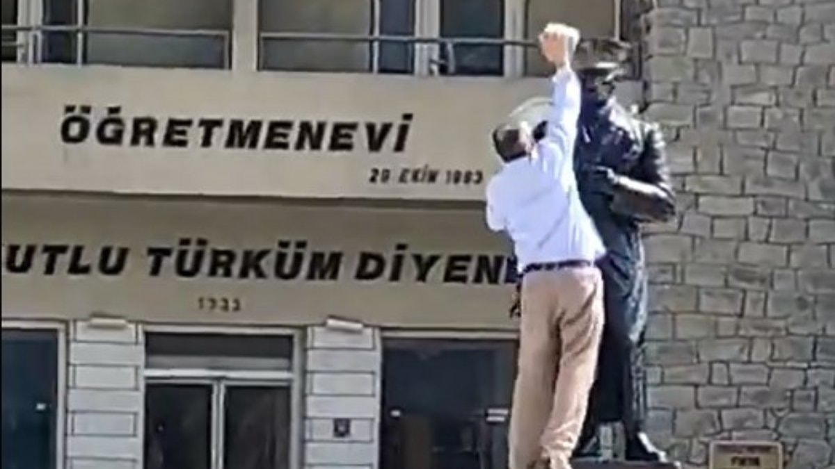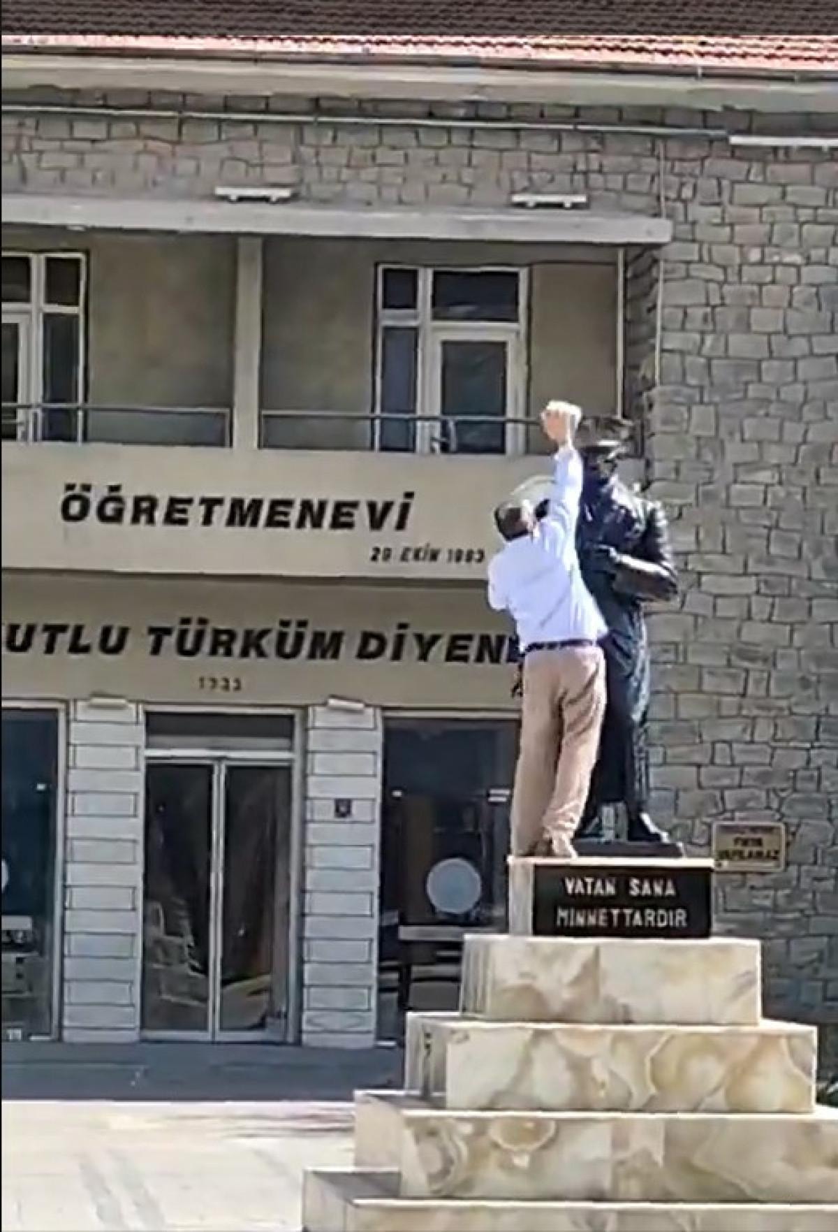 Öğle saatlerinde Gazi Caddesi'nde bulunan eski öğretmenevi önünde meydana gelen olayda, Atatürk heykeline çıkan bir kişi, heykelin baş kısmına taşla vurmaya başladı.