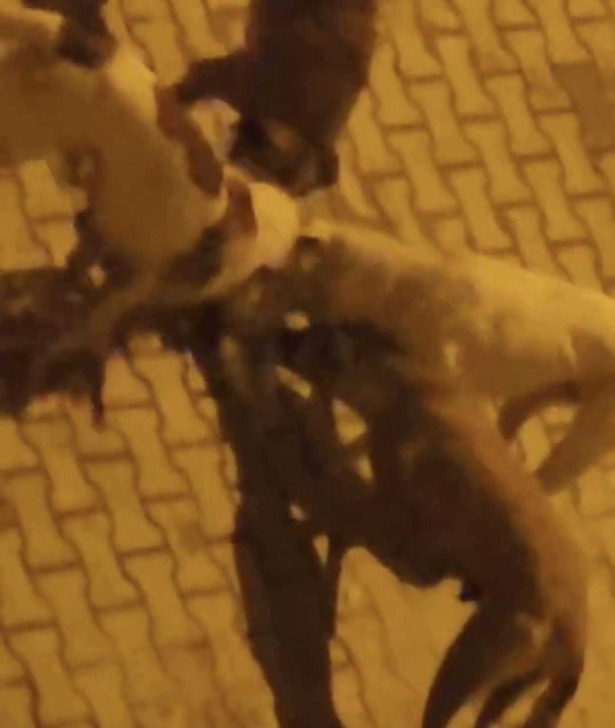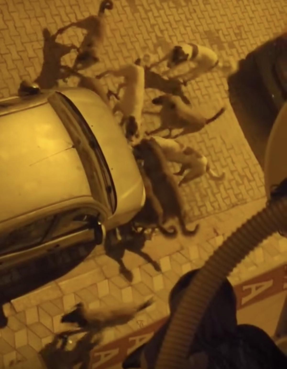 Şahıs, başıboş sokak köpeklerinin bir kediye saldırdıklarını fark etti. Köpekler, boğdukları kediyi başında bir süre bekledikten sonra parçaladı.