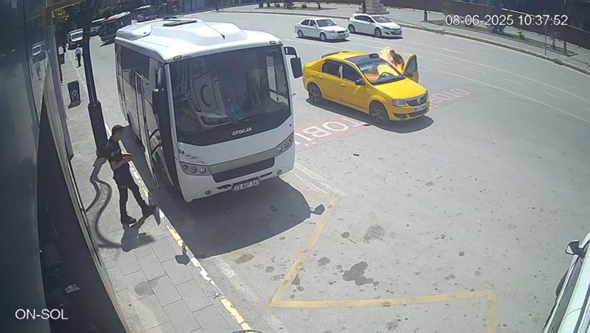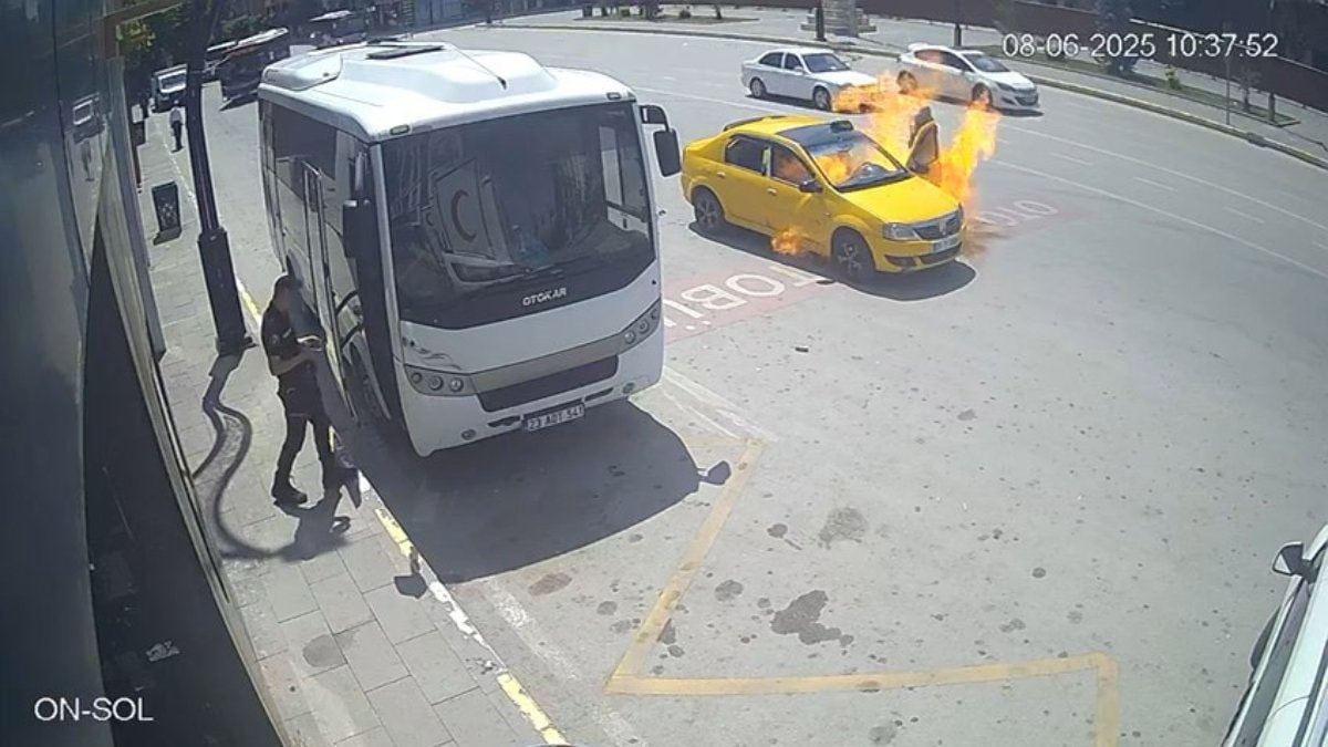 Aracın bir anda alev alması ve sürücünün son anda kurtulması güvenlik kameralarına saniye saniye yansıdı.
