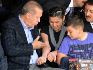 Ağaçtan inerken kollarını yaralayan Nazife Kayacı yanındaki 12 yaşındaki oğlu Burak ile birlikte Cumhurbaşkanı Erdoğan'ın yanına gidip boş koltuğa oturdu.
