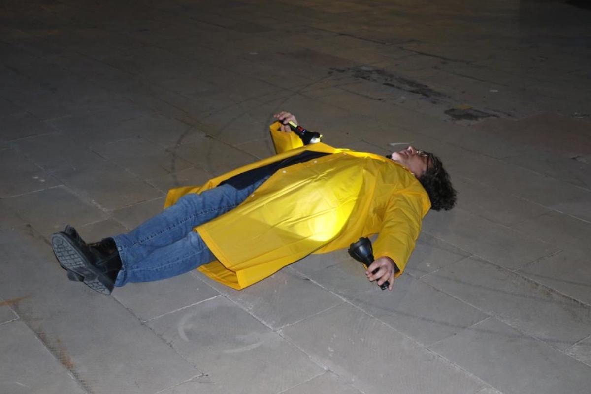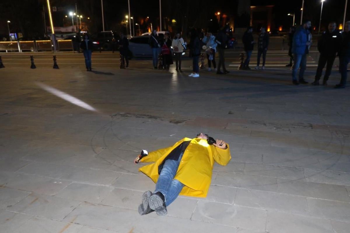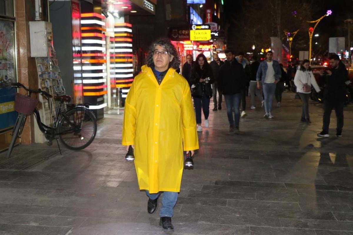 Mehmet Kavukcu, performansında, depremin meydana geldiği saatte sarı renkli yağmurluk giyerek elinde iki fenerle şehrin en işlek caddesi olan Ordu Caddesi'nde sessiz bir yürüyüş gerçekleştirdi.