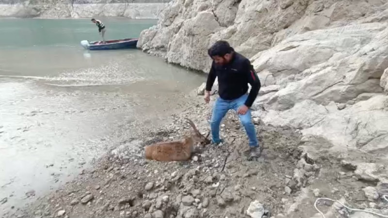 Keçinin balçığa saplandığını gören Şevket Gültekin, Görkem Oğuz ve Ahmet Öztürk, Karanlık Kanyon'dan bot ile balçığa ulaştı.