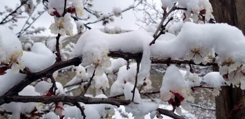 Erzincan’da nisan ayında yağan kar, çiçek açan meyve ağaçlarını kar altında bırakırken, zirai don olayı vatandaşı korkutuyor.