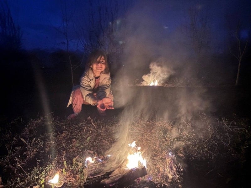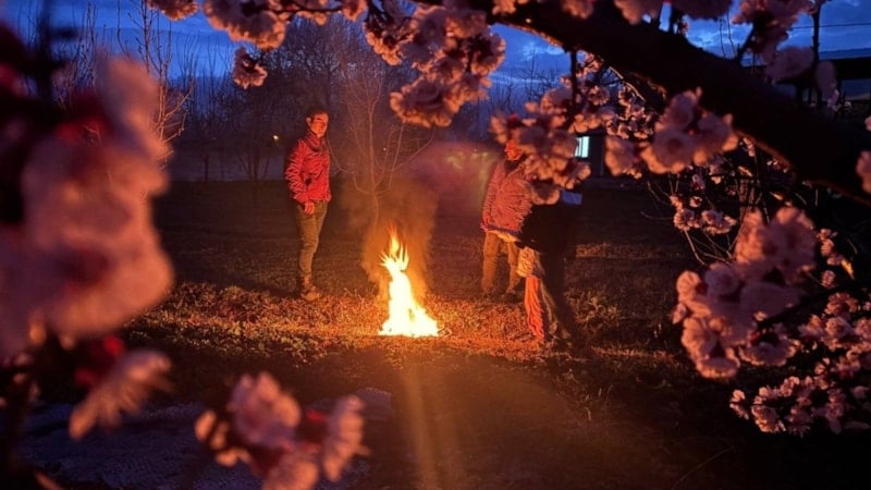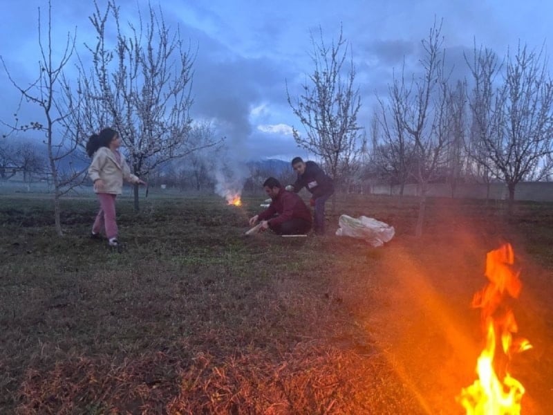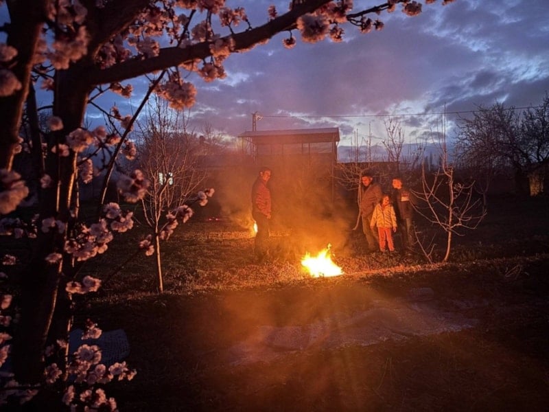 Gece boyunca bahçelerinde nöbet tutan çiftçiler, farklı noktalarda kontrollü ateşler yakarak oluşan ısı ve duman sayesinde ağaçların zarar görmesini önlemeye çalışıyor.