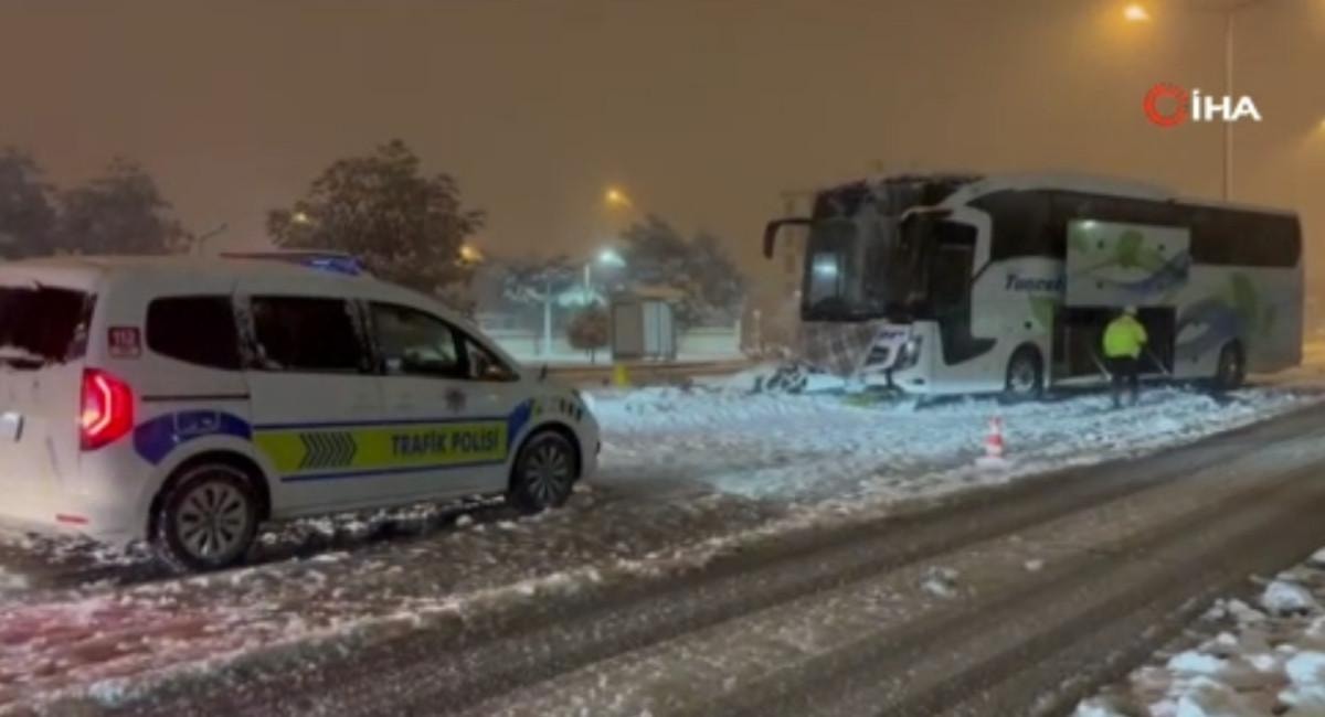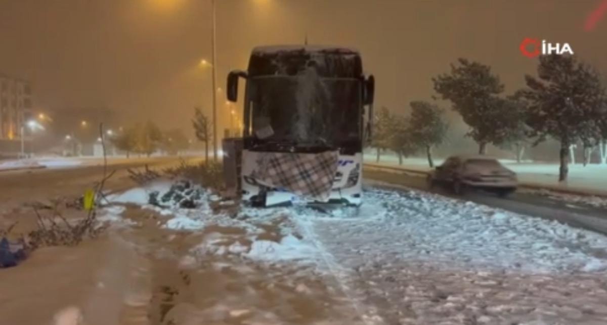 Erzincan’da kent merkezinde Recep Tayyip Erdoğan Bulvarı üzerinde, S.Y. yönetimindeki 62 AAE 555 plakalı yolcu otobüsü, karda kayıp yoldan çıkarak orta refüjdeki aydınlatma direğine çarptı.
