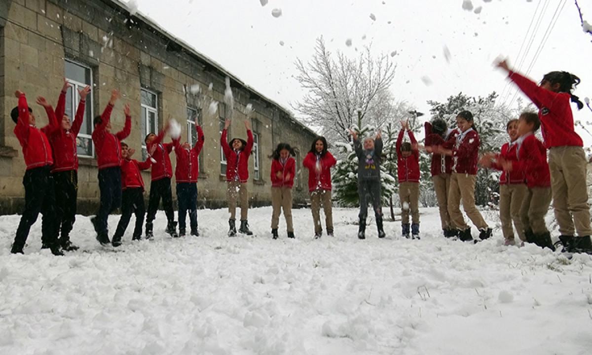 Kar yağışına sevinen çocuklar da okul bahçesinde kardan adam yaptı, kar topu oynadı.