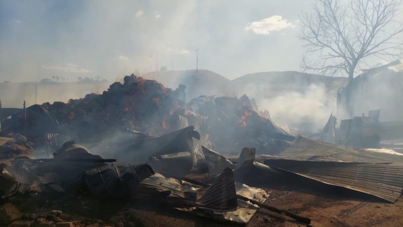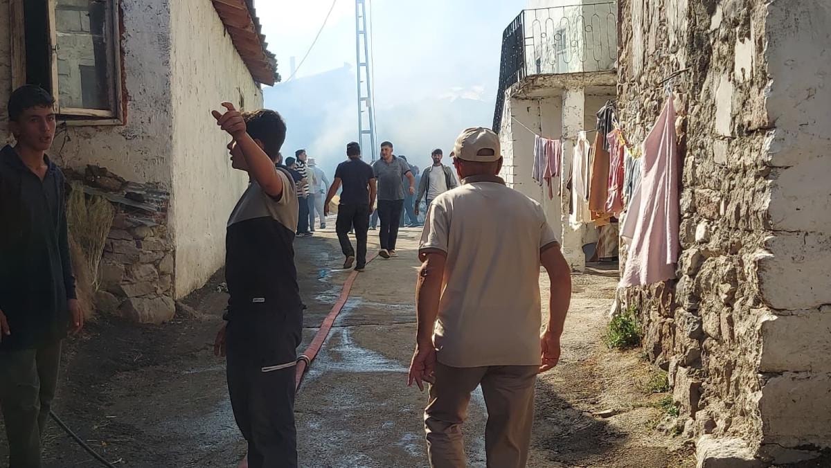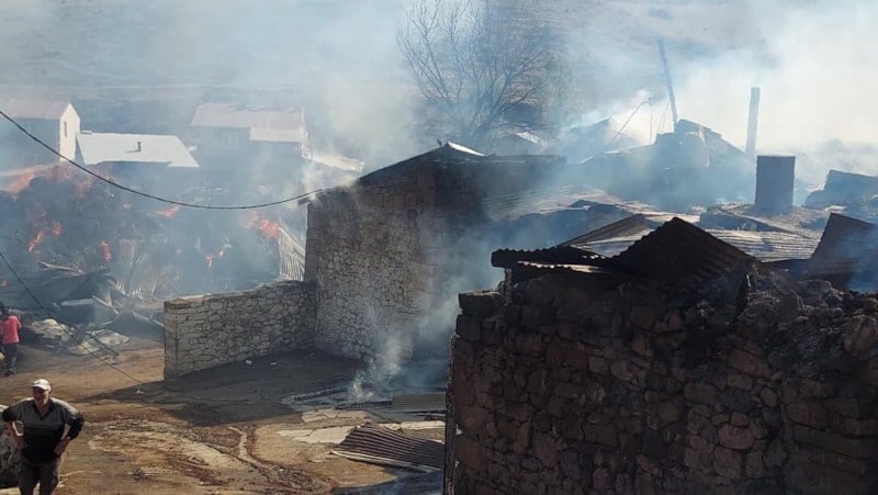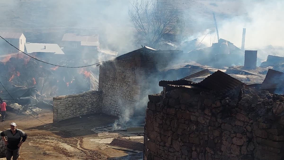 Onlarca ev, ahır ve köyün muhtelif bölgelerinde yığılmış ot balyalarında yangın devam ederken, çok sayıda hayvan da telef oldu.