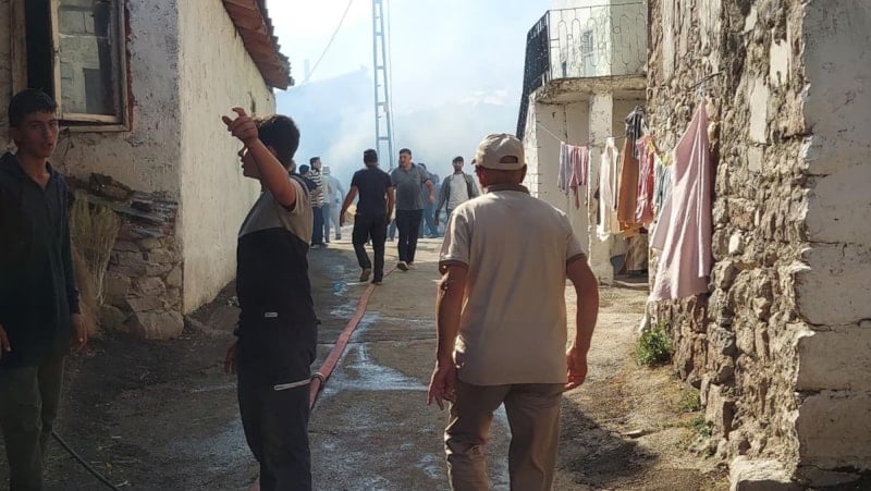 Köyde büyük panik yaşanırken, ekipler hem alevlerle hem de rüzgarın olumsuz etkisiyle mücadele ediyor.