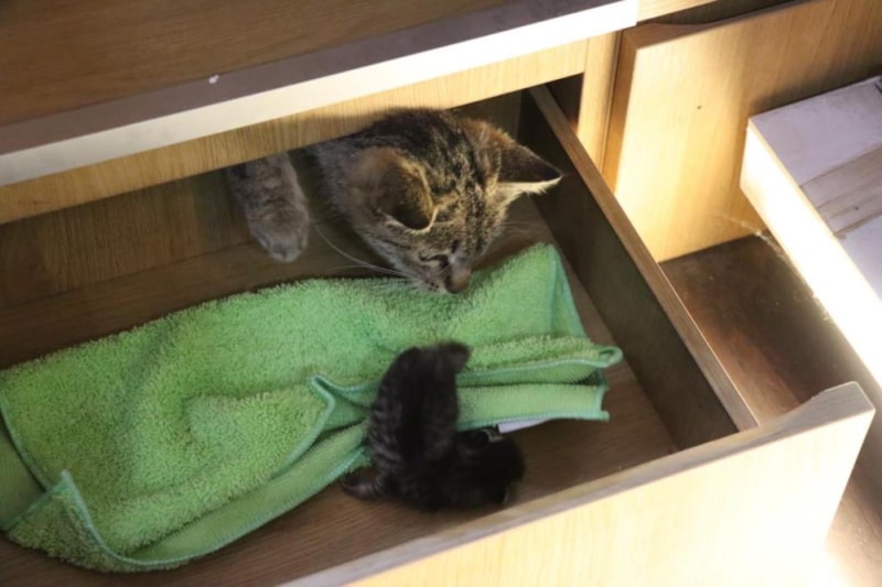 Erzurum’un Oltu ilçesinde bir sokak kedisi, güvenli limanı bir esnaf dükkanında buldu; çekmeceyi doğumhane yaptı.