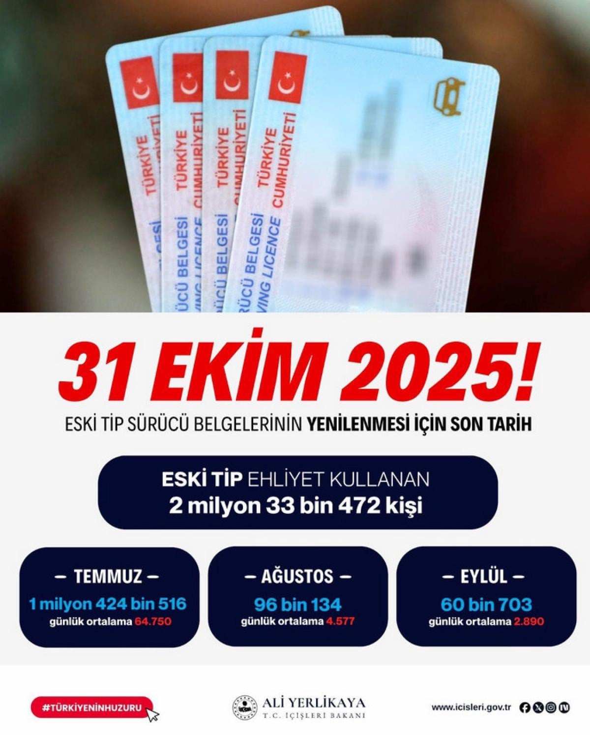 - İçişleri Bakanı Ali Yerlikaya, eski tip sürücü belgelerinin yenilenmesi için son tarihin 31 Ekim 2025 olduğunu açıkladı.