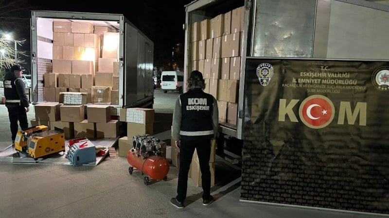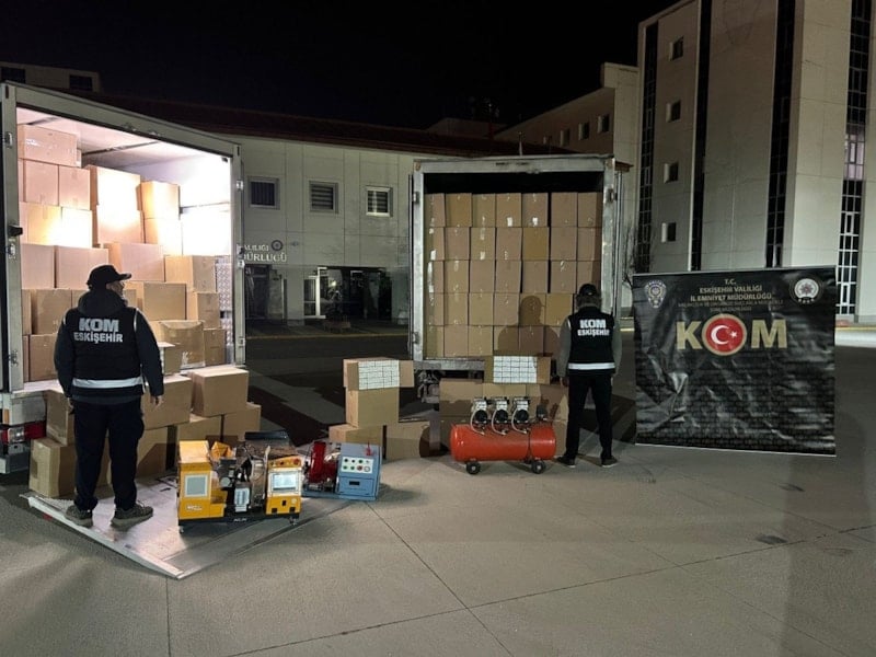 Eskişehir’de polisin operasyonu sonucu 5 milyon 800 bin adet bandrolsüz boş makaron, 60 bin adet doldurulmuş makaron, 205 kilogram açık kıyılmış tütün ele geçirildi.