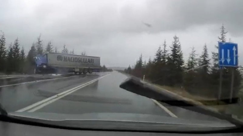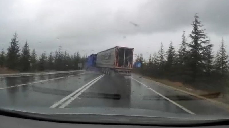 Görüntüde tırın karşı şeride geçtiği ve otomobille çarpışarak yoldan çıktığı yer alıyor.