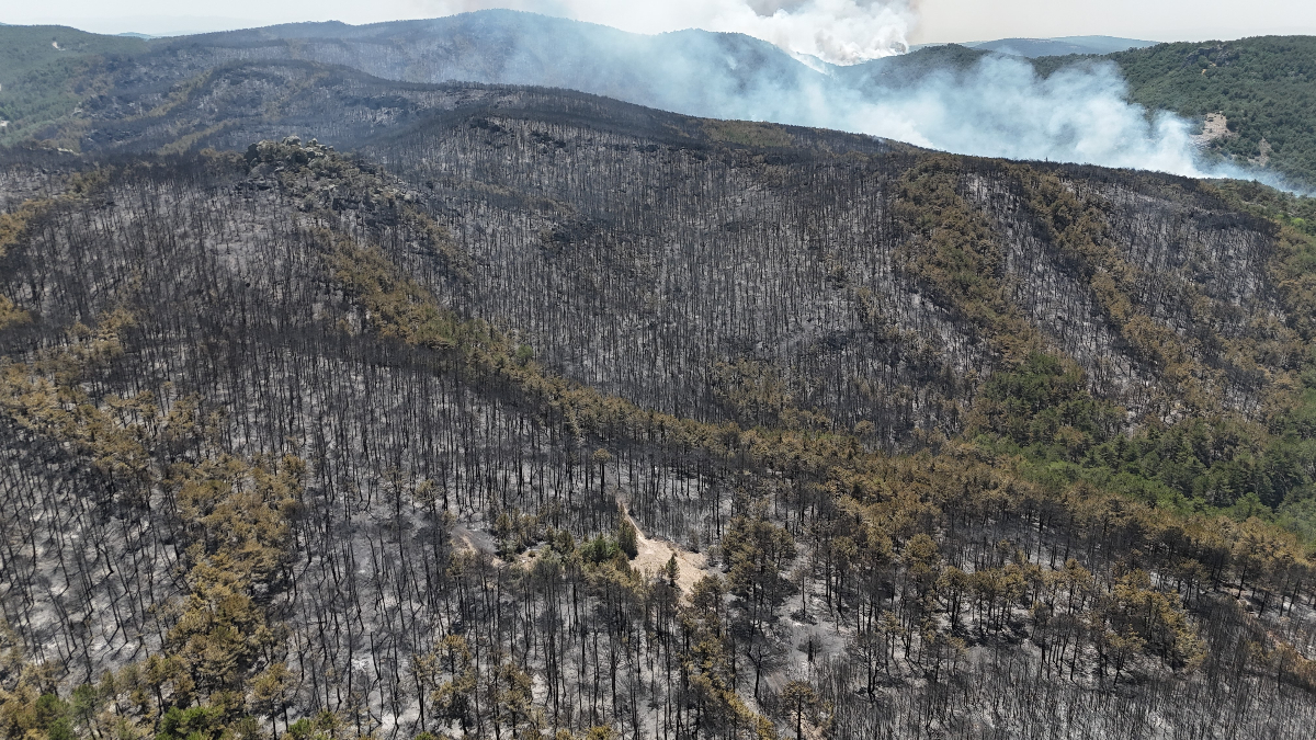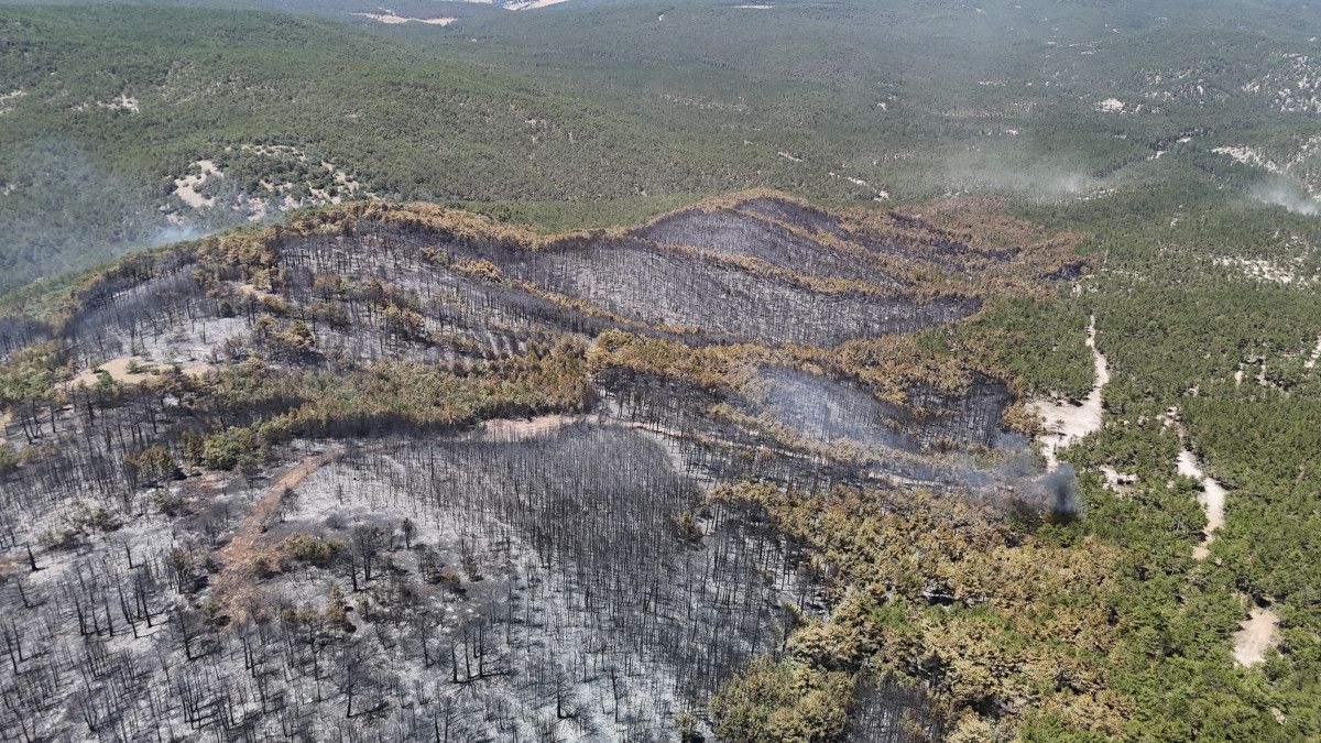 Yangının 2 gün sürdüğü ormanlık alan küle dönerken, bölge drone ile görüntülendi.