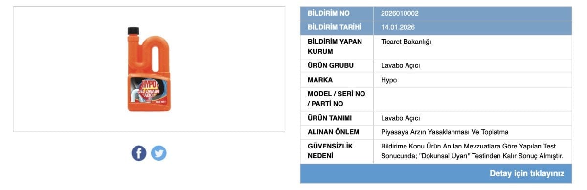 Ticaret Bakanlığı, evlerde yaygın olarak kullanılan Hypo Jel Lavabo Açıcı adlı temizlik ürünüyle ilgili önemli bir uyarı yayımladı.