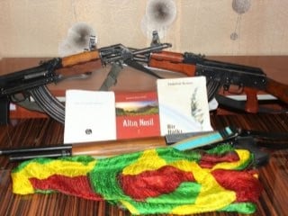 Evde yapılan aramada, yatak odasındaki kullanılmayan ebeveyn banyosunda 2 kalaşnikof marka otomatik tüfek, av tüfeği, 2 şarjör, 319 fişek ele geçirildi.