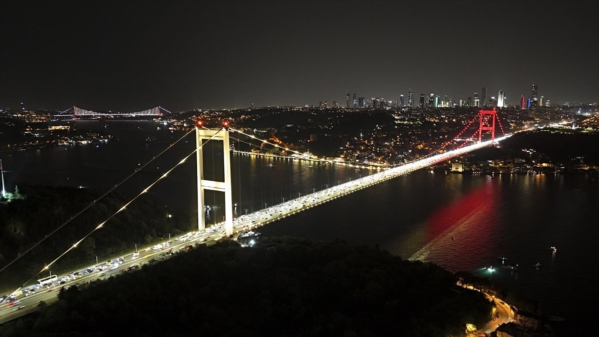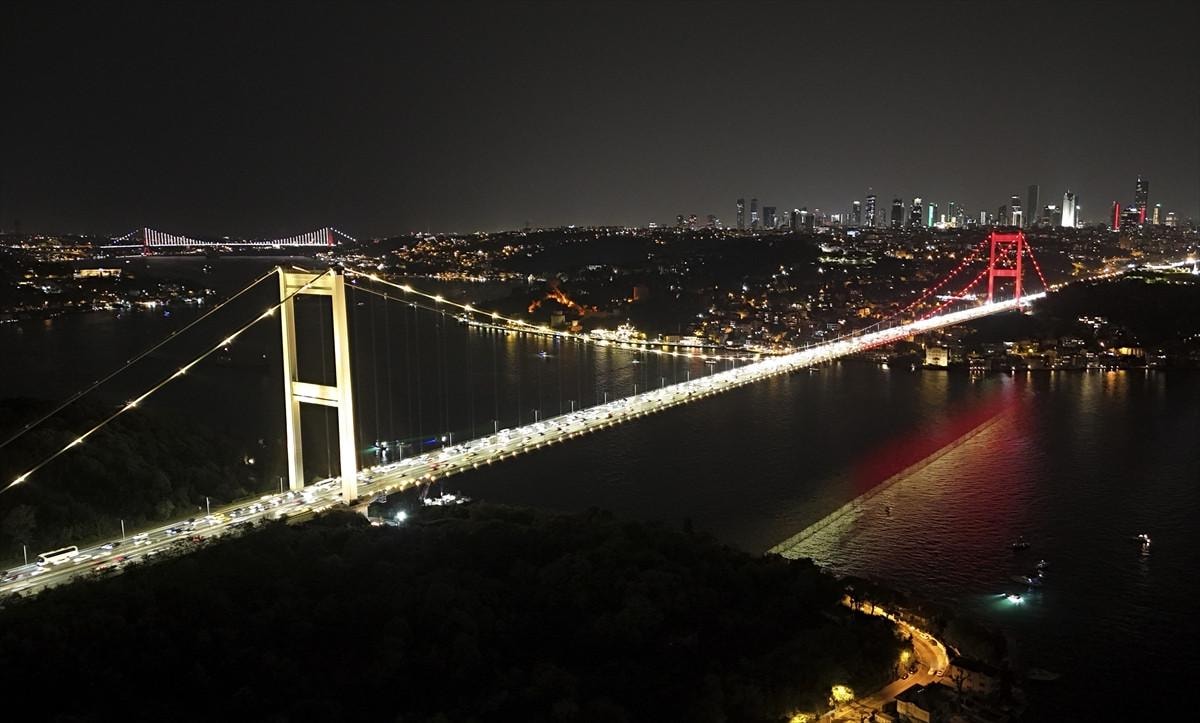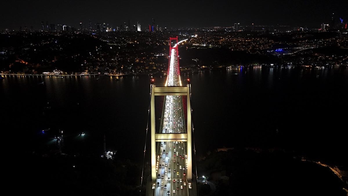 Gece saatlerinde sarı ve kırmızı renklere bürünen köprü, hem boğaz trafiğinde hem de sosyal medyada büyük ilgi gördü.