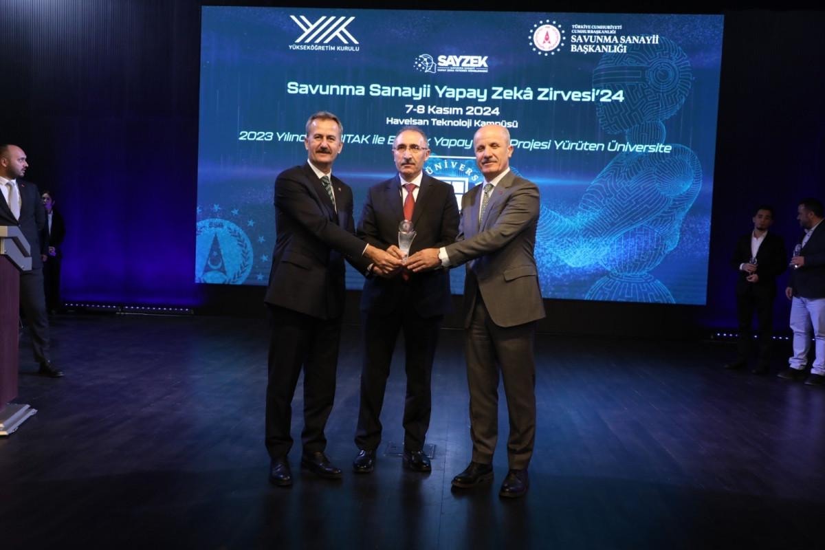 "2023 Yılında TÜBİTAK ile en çok yapay zeka projesi üreten üniversite” ödülü anons edilirken sahneye Fırat Üniversitesi Rektörü Prof. Dr. Fahrettin Göktaş davet edildi. Rektör Prof. Dr. Göktaş ödülü YÖK Başkanı Prof. Dr. Özvar ve Cumhurbaşkanlığı Savunma Sanayii Başkanı Prof. Dr. Görgün’den aldı.