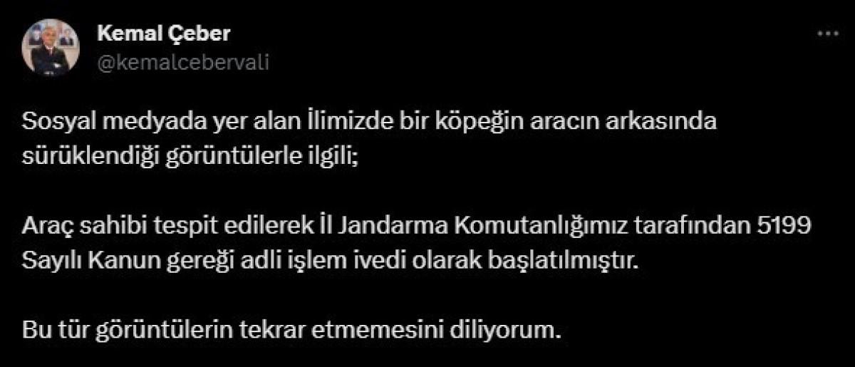 Sosyal medyada yer alan ilimizde bir köpeğin aracın arkasında sürüklendiği görüntülerle ilgili araç sahibi tespit edilerek İl Jandarma Komutanlığımız tarafından 5199 Sayılı Kanun gereği adli işlem ivedi olarak başlatılmıştır. Bu tür görüntülerin tekrar etmemesini diliyorum.