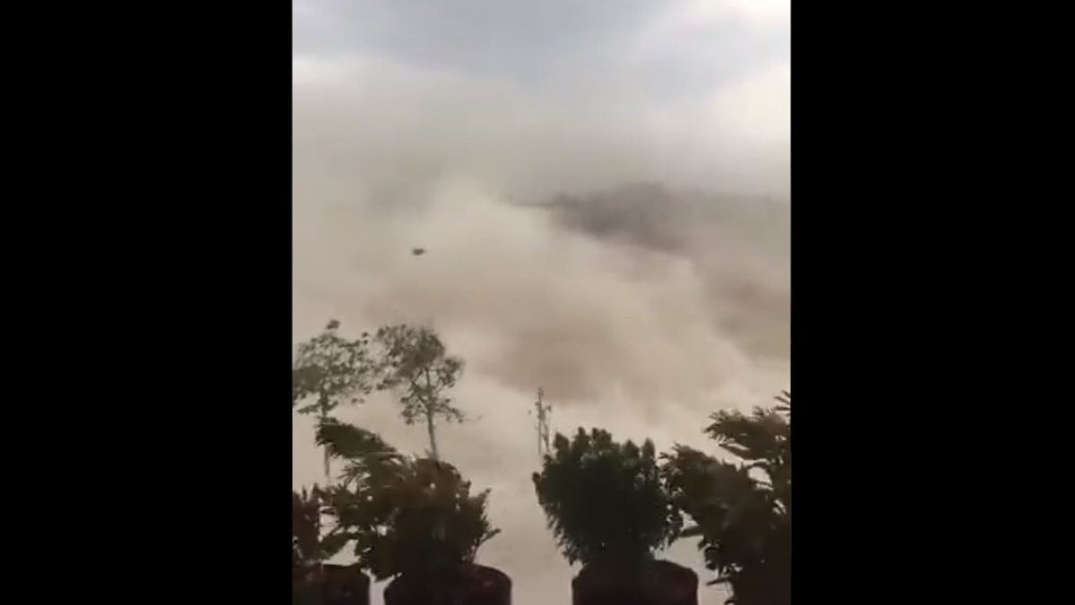 Şiddetli kum fırtınasıyla gökyüzü tozla kaplanırken, videoyu çeken vatandaşın "Kıyamet, aman aman. Bu ne? Sen koru Yarabbim" dediği duyuluyor.