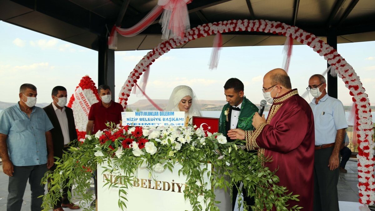 Zeugma'da belirlenen alanda Nizip Belediye Başkanı Mehmet Sarı, tarih bölümü mezunu olan Zeynep ve İbrahim Keskin çiftinin nikahını kıyarak, çifte mutluluklar diledi.