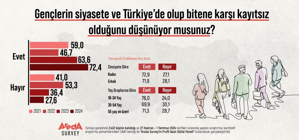Buna göre vatandaşların yüzde 72,4’ü, gençlerin siyasete ve Türkiye’de olup bitene karşı kayıtsız olduğunu düşünüyor.