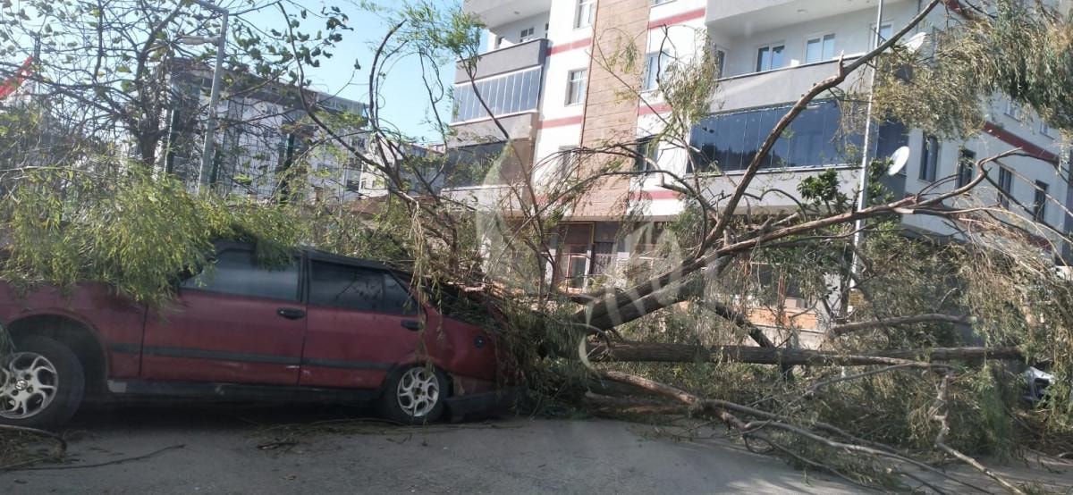 Rüzgarın etkisiyle kök kısmından kopan ağaç, park halindeki bir aracın üzerine düştü.