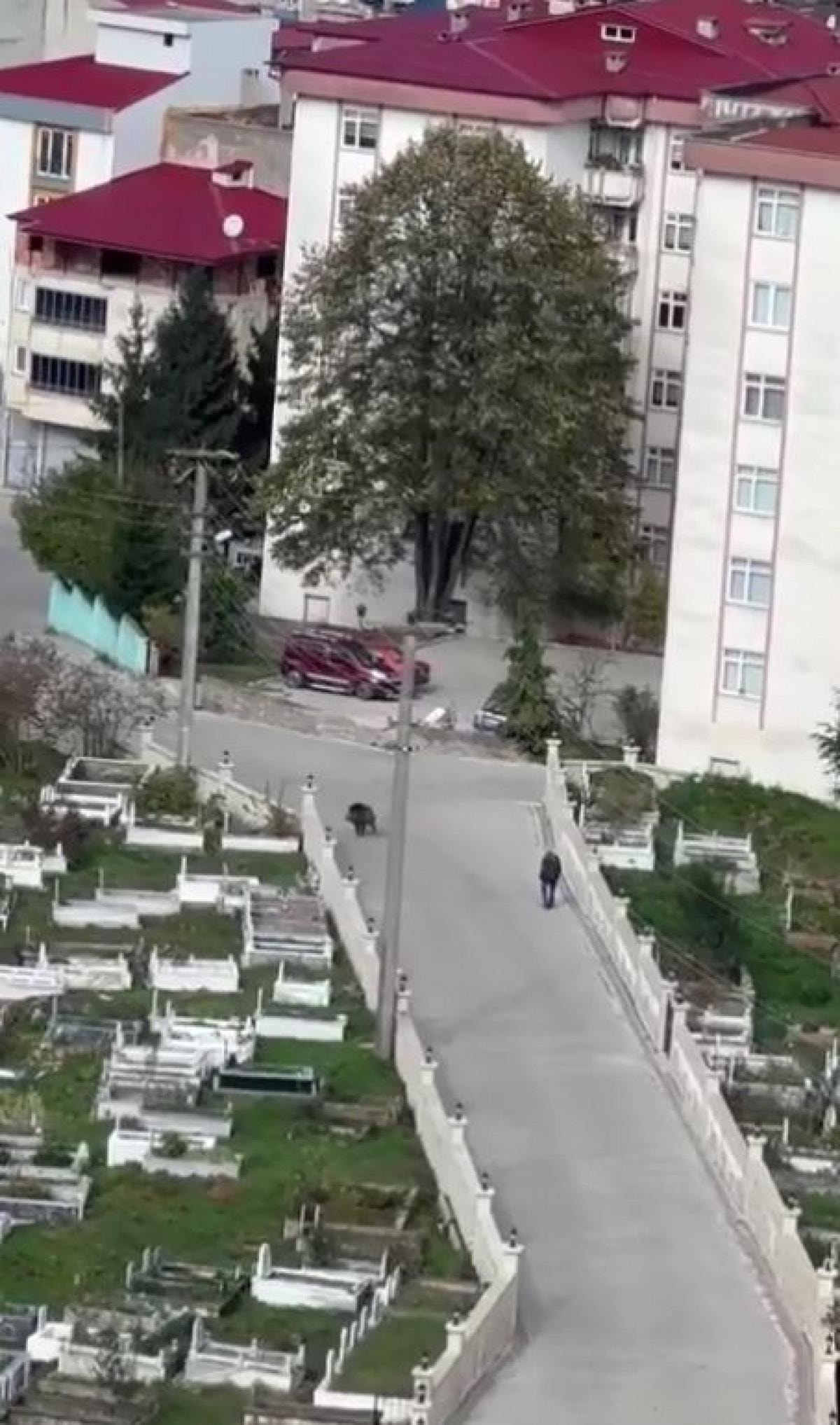 Sabah saatlerinde Espiye ilçesine bağlı Çam Mahallesi'nde meydana gelen olayda, yüksek kesimden mahalledeki yerleşim yerine inen yaban domuzu, çevresi mezarlık olan yolda yürüyen bir kişinin peşinden koşmaya başladı.