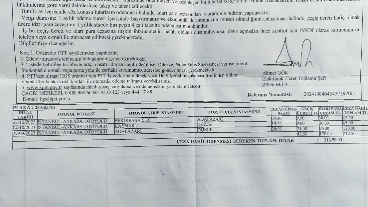 Bodur, tebligatlarda 27 Aralık, 4 Ekim ve 27 Eylül 2023 tarihlerinde İstanbul-Ankara otoyolundaki HGS gişelerinden geçiş yaptığı gerekçesiyle aracının plakasına toplam 212,50 TL ceza kesildiğini, bu miktarın içinde 42,50 TL olan geçiş ücretinin yanı sıra 170 TL idari para cezası da yer aldığını belirtti.