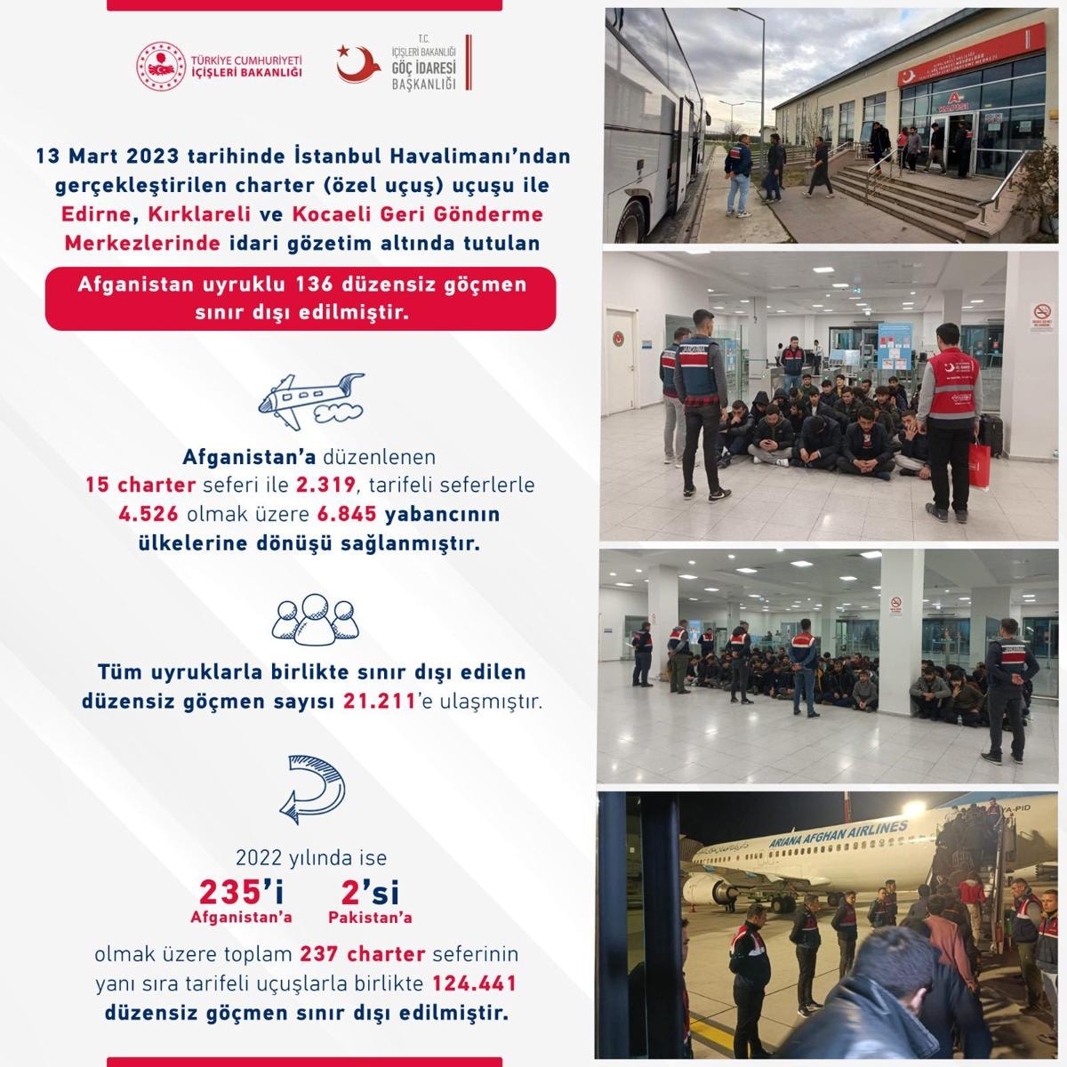 Buna göre, bugün İstanbul Havalimanı'ndan gerçekleştirilen toplam 4 charter (özel uçuş) ile 136 Afganistan uyruklu göçmen sınır dışı edildi.
