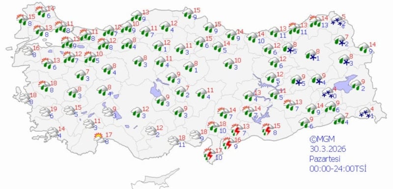 Doğu bölgelerde daha az yağışlı, ancak yüksek kesimlerde kar veya karla karışık yağmur görülebilir.