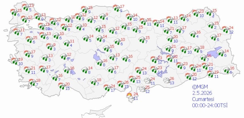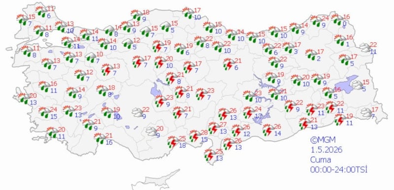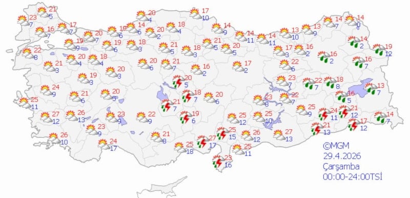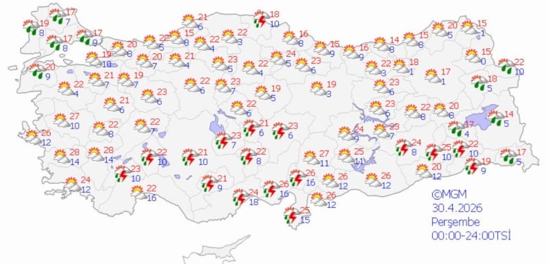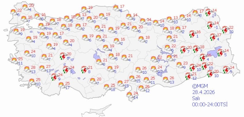 MGM'nin son verilerine göre ülke genelinde, özellikle iç, güney ve doğu bölgelerde gök gürültülü sağanaklar etkili olacak. Sıcaklıkların ise mevsim normalleri civarında seyretmesi bekleniyor.