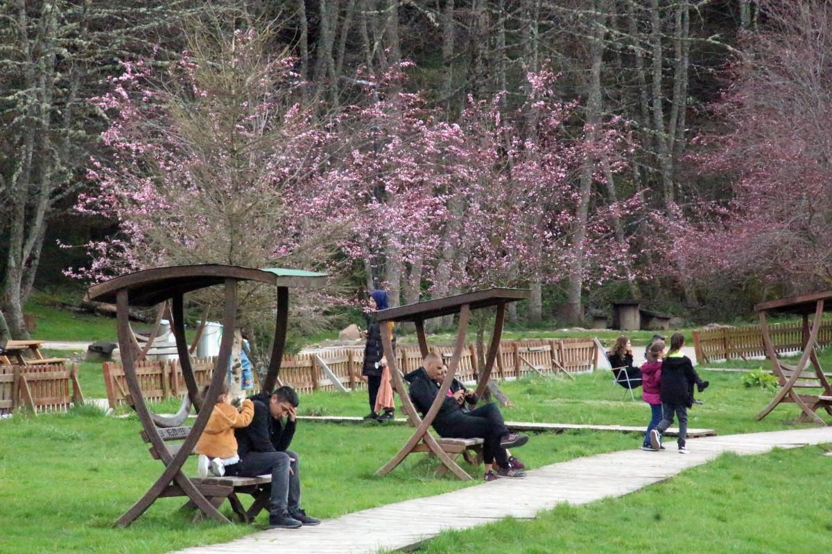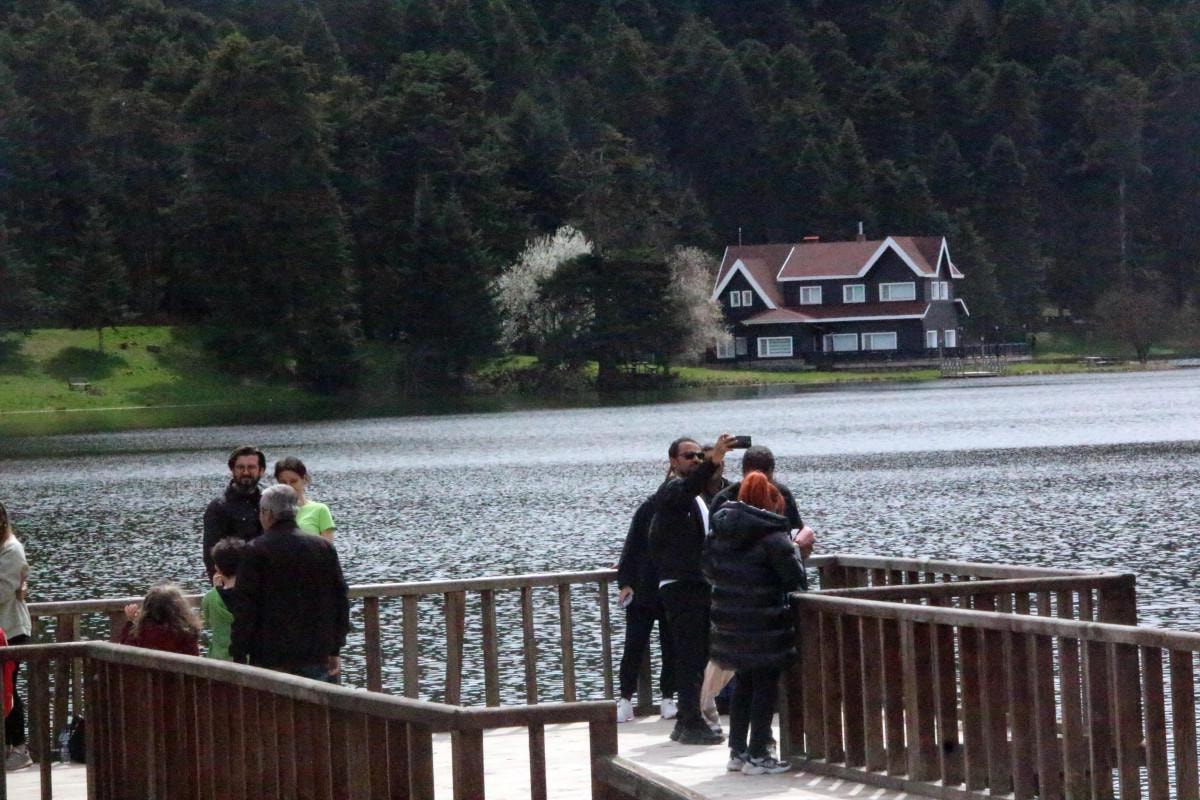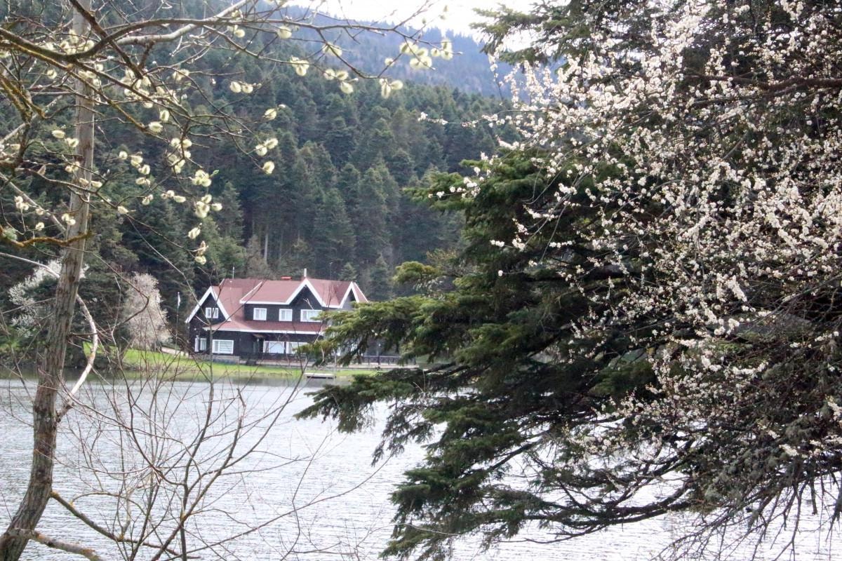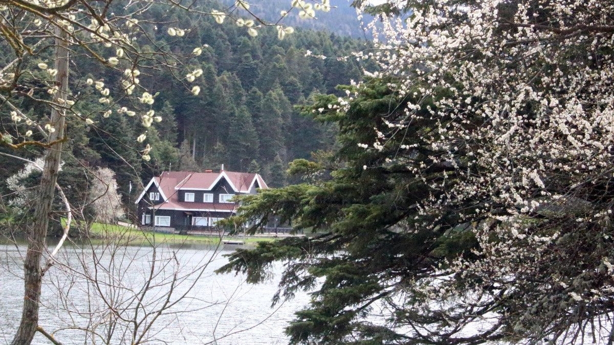 Çevresi yemyeşil çam ormanlarıyla çevrili Gölcük’te göl kenarındaki ağaçların pembe ve beyaz tonda açan çiçekleriyle buluşması ziyaretçilerden ilgi gördü.