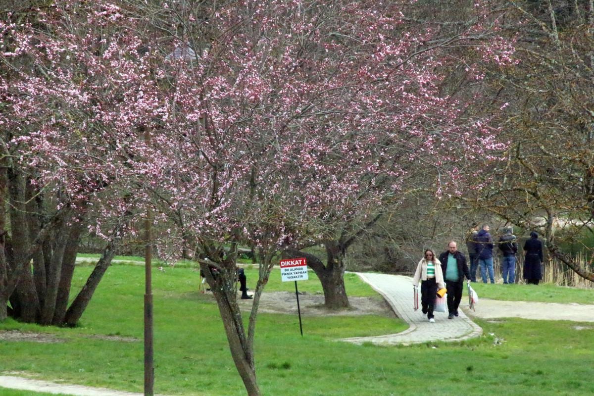 Göl çevresinde bulunan ağaçlardaki rengarenk çiçekler ziyaretçileri adeta mest etti.