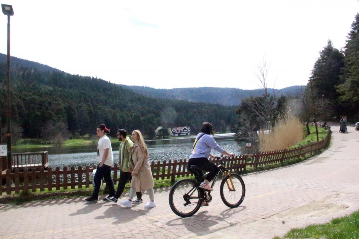 Hafta sonu güneşin de yüzünü göstermesiyle birlikte tabiat parkına gelenler göl kenarında bisiklete binip, iskele üzerinde her anı ölümsüzleştirdi.