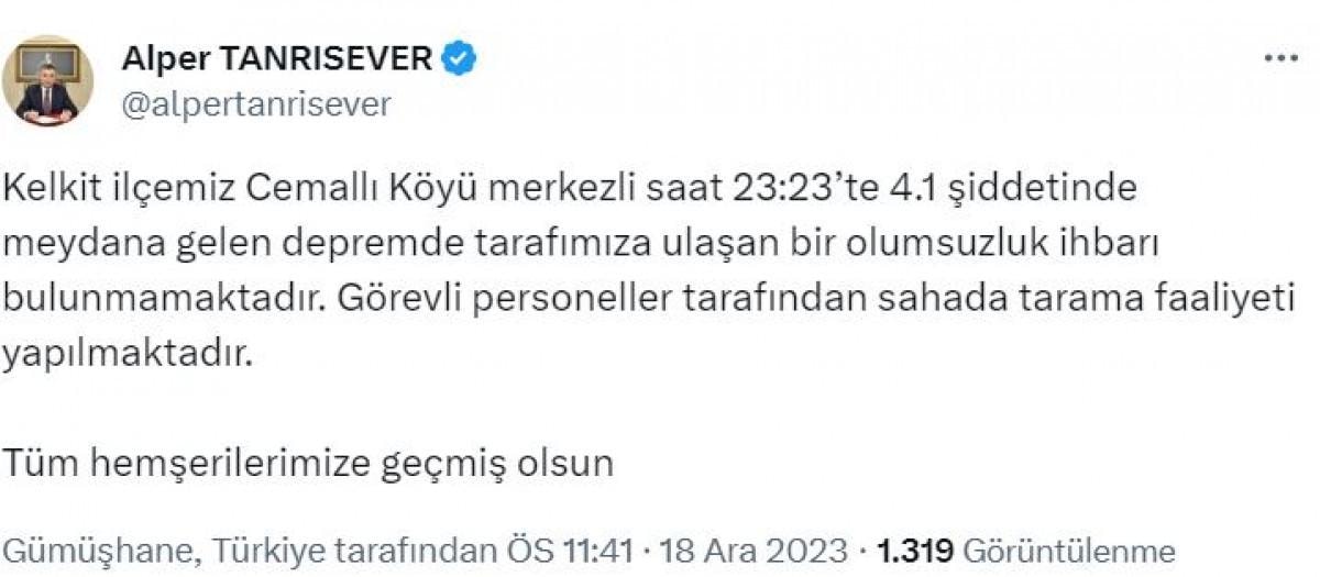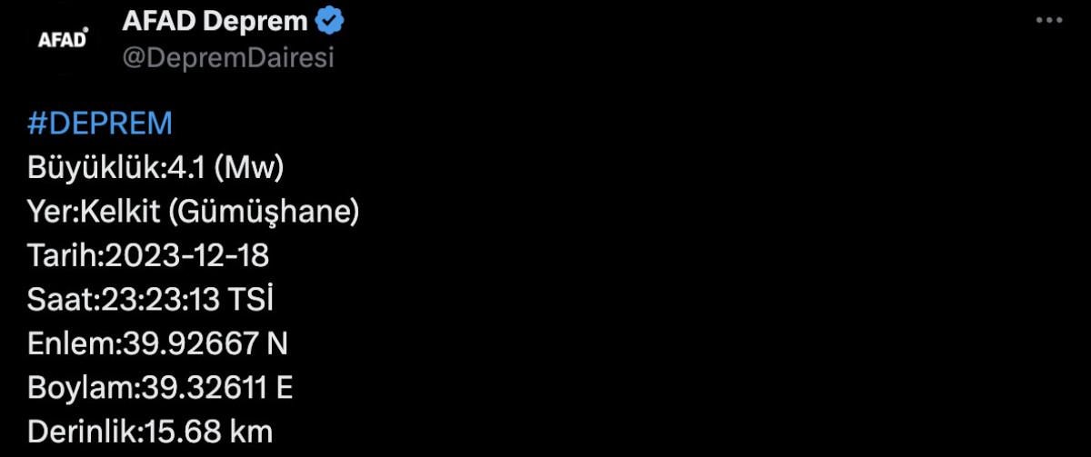 Gece saatlerinde 4.3 büyüklüğündeki depremle sarsılan Gümüşhane'nin Kelkit ilçesinde saat 23.23'te 4.1 büyüklüğünde deprem meydana geldi.