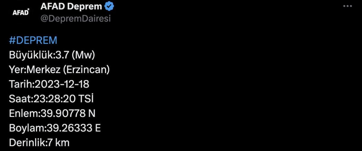 Saat 23.28'de bu kez Erzincan merkezde 3.7 büyüklüğünde bir deprem yaşandı.