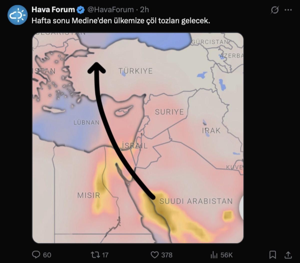 Hava Forum, X hesabından yaptığı paylaşımda, “Hafta sonu Medine'den ülkemize çöl tozları gelecek.” ifadelerini kullandı.