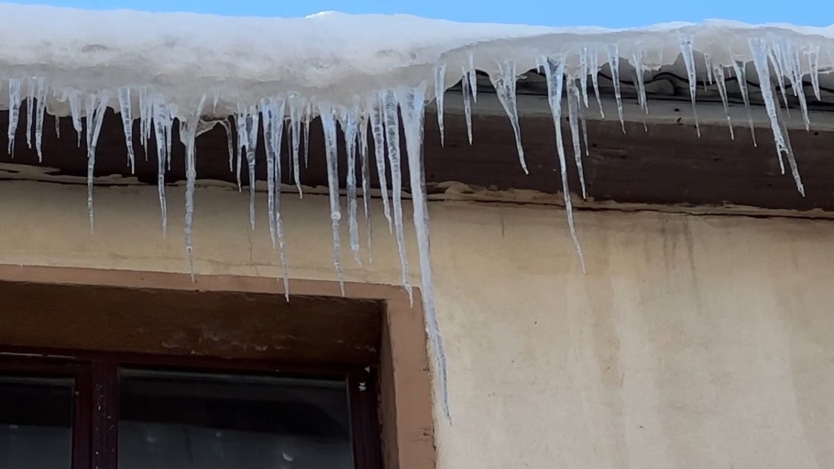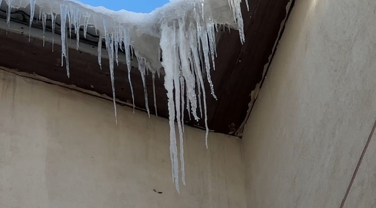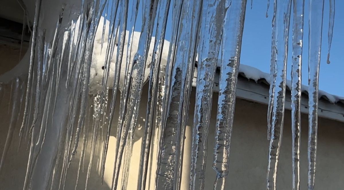 Dondurucu soğuklar yüzünden evlerin çatılarından uzanan buz sarkıtları 2 metreyi aştı.